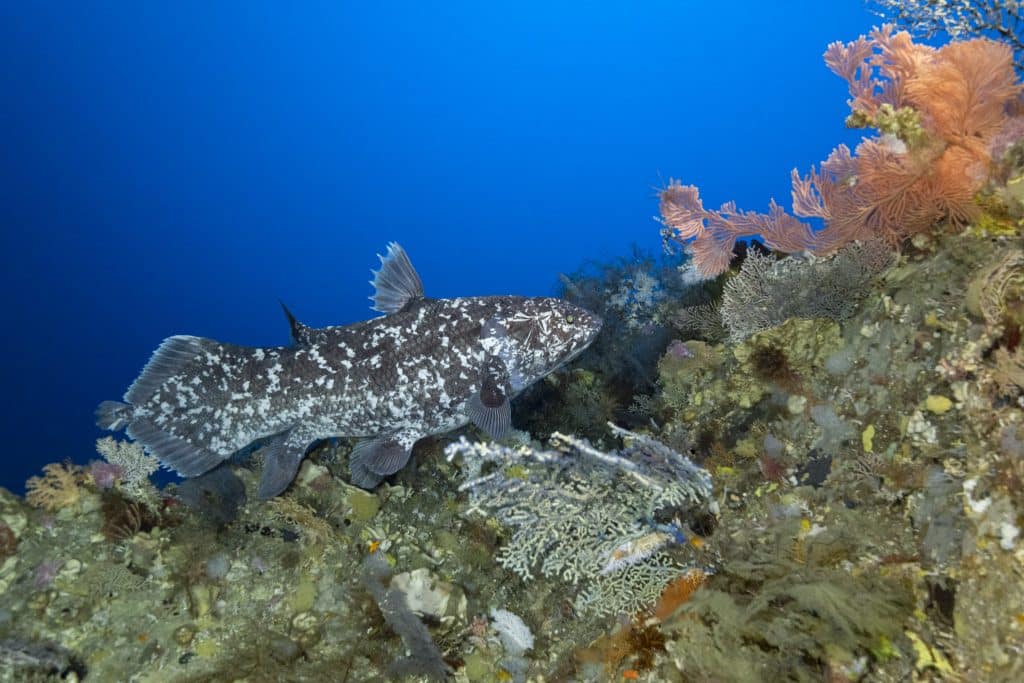 2024. Un bateau prêté permet enfin de viser le Nord des Moluques. Une première plongée à –125 m confirme l’intérêt du site ; deux jours plus tard, plancher à –150 m, puis remontée le long d’un énorme bloc… Un cri étouffé à travers l’embout du CCR : « cœlacanthe ! » Rencontre à –144 m, photos et vidéo déclenchées avant le fond (rare), cinq minutes d’observation, puis la longue remontée. Le lendemain, Alexis et Julien revoient le même individu, confirmé par photo-identification (motif de taches blanches de chaque côté du corps).